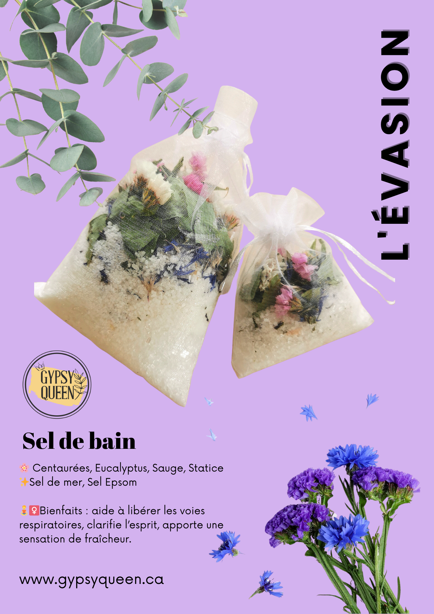 ✨ Sel de bain floral L’Évasion (format mini – pour bain de main ou de pied), à base d’eucalyptus, pour libérer les voies respiratoires et favoriser la détente.