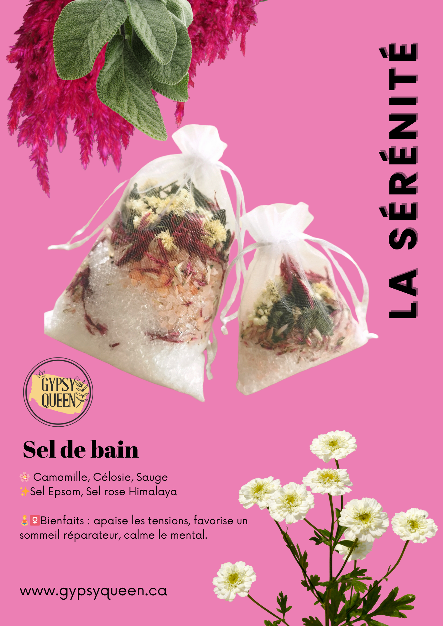 ✨ Sel de bain floral La Sérénité (format mini – pour bain de main ou de pied) de la Ferme Gypsy Queen, aux douces effluves florales pour un moment de calme absolu.